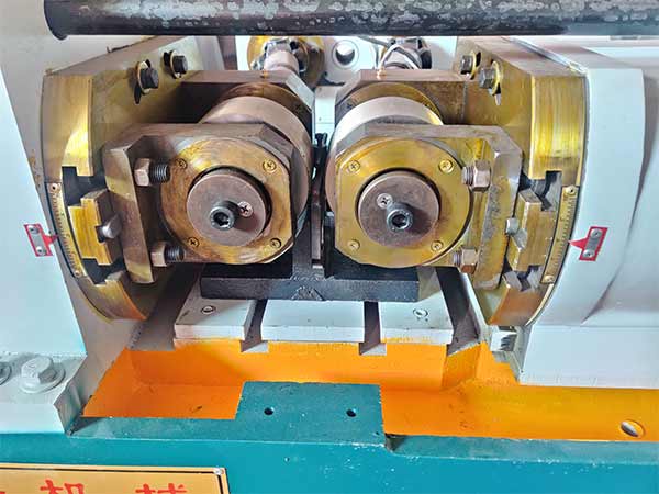 本機(jī)的兩主軸中心距調(diào)整為兩主軸座分別對中心調(diào)整,即工件滾壓時處于機(jī)器中心位置,對滾壓長工件并穿過機(jī)器較為方面。